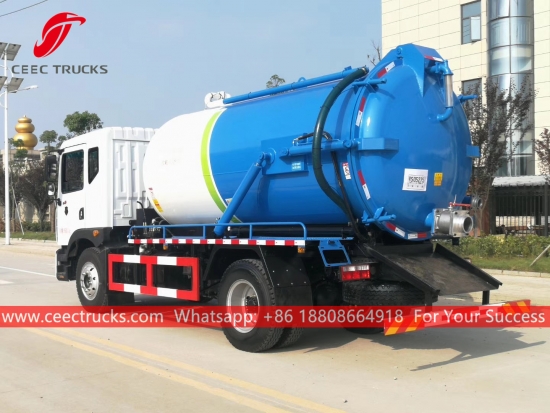 Trak sedut vakum Dongfeng 10cbm, model Pacuan Tangan Kiri 4x2 casis, kotak gear manual 6-anjakan, enjin diesel CUMMINS 180HP, mengecat dan logo bergantung pada keperluan.