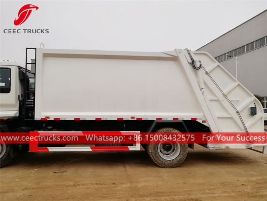 Trak pemadat sampah ISUZU 12cbm berkualiti tinggi, yang menggunakan enjin diesel 4HK jenama ISUZU, dengan kuasa enjin sehingga 240HP, kotak gear manual 6-anjakan MLD untuk pengendalian mudah, badan pemadat bahan keluli berkualiti kuat dengan lukisan antikarat dalam dan luar, semua logo mengikut keperluan.