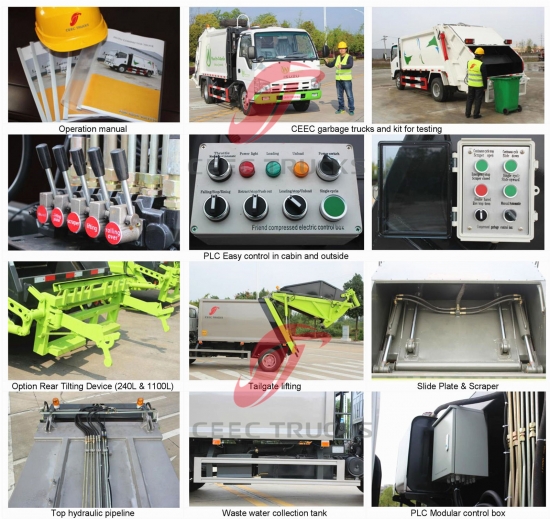 Kit trak termampat sampah 12000Liter standard Eropah, yang menggunakan badan pemadat bahan keluli kekuatan tinggi, model PLC kawalan import, peranti kawalan silinder hidraulik, kotak kawalan versi Inggeris untuk operasi yang mudah