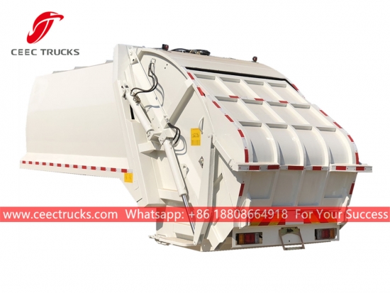 Badan trak pemampat sisa 12,000Liter standard Eropah, yang menggunakan badan pemadat bahan keluli berkekuatan tinggi, model PLC kawalan import, peranti kawalan silinder hidraulik, kotak kawalan versi Bahasa Inggeris untuk operasi mudah.