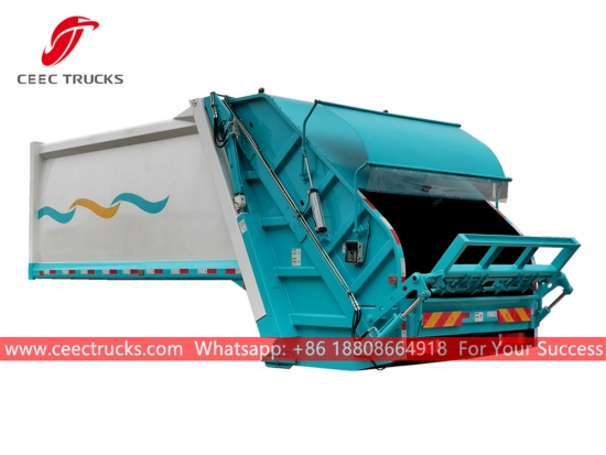 Struktur badan lori sampah termampat 12,000Liter berkualiti tinggi, yang menggunakan badan pemadat bahan keluli kekuatan tinggi, model PLC kawalan import, peranti kawalan silinder hidraulik, kotak kawalan versi Bahasa Inggeris untuk operasi yang mudah.