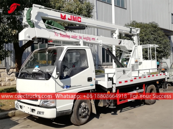 Trak angkat kren baldi 14m, casis model 4x2 jenama JMC, kotak gear manual 5-anjakan, enjin diesel 152HP, mengecat dan logo bergantung pada keperluan, Kotak kawalan bahasa pelanggan.