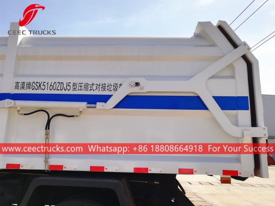 Trak pengutip sampah Dongfeng 15000liter, yang menggunakan casis Dongfeng LHD / RHD 4*2, enjin diesel CUMMINS 210HP, kotak gear manual 8-anjakan, pintu belakang hidraulik untuk pengendalian yang mudah. Semua lukisan dan logo bergantung pada keperluan.