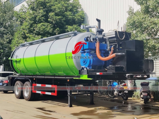 Pembetung Vakum Semi-treler (jugadipanggiltreler tangki kumbahan, treler tangki vakum, treler separa penyedut pembetung, treler separuh tangki septik, sistem vakum dipasang treler, pengeluar trak tangki vakum China)ialahdigunakan untuk mengumpul, mengangkut dan mengeluarkan cecair seperti air kotor, enap cemar, septik, minyak mentah, dan bahan pepejal seperti batu kecil, batu bata juga. Ia sesuai untuk membersihkan pembetung, cesspit, cesspool, gully, dll. Ia digunakan secara meluas dalam persekitaran dan bidang sanitasi.