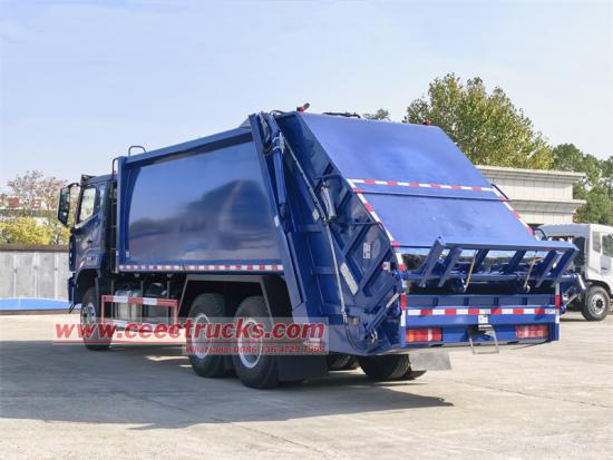 Trak pemadat sampah Howo 6x4 20 cbm diubah suai berdasarkan casis Sinotruk Howo NX 6x4, dengan jarak roda 4600+1350mm. Ia dilengkapi dengan enjin Sinotruk WD615.47, HW19710, dan kotak gear 10 kelajuan. Bahagian atas badan ialah bekas sampah termampat keluli karbon berbentuk arka 20 meter padu dengan rawatan anti-karat dan kalis karat, penutup belakang yang ditutup sepenuhnya, dan mekanisme penarikan tong gantung. Pemuatan dan pemunggahan sampah dikawal oleh sistem kawalan elektronik CAN-BUS, khususnya melalui tiga titik kawalan: kotak kawalan elektronik di dalam kabin, tuil operasi hidraulik manual di sebelah pemandu, dan kotak kawalan elektronik di pintu belakang.
