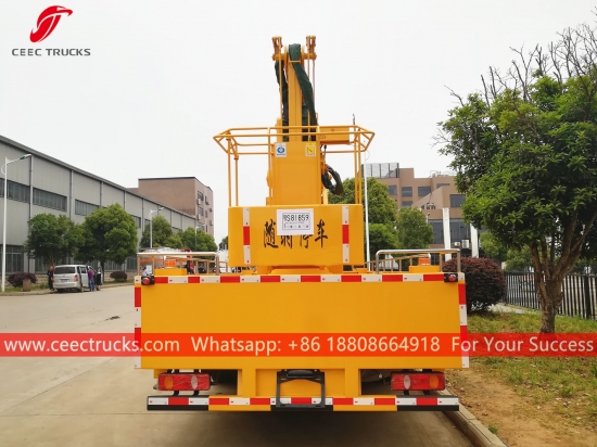 Trak angkat lelaki 22m, casis model 4x2 jenama Dongfeng, kotak gear manual 8-anjakan, enjin diesel CUMMINS 190HP, lukisan dan logo bergantung pada keperluan, Kotak kawalan bahasa pelanggan.