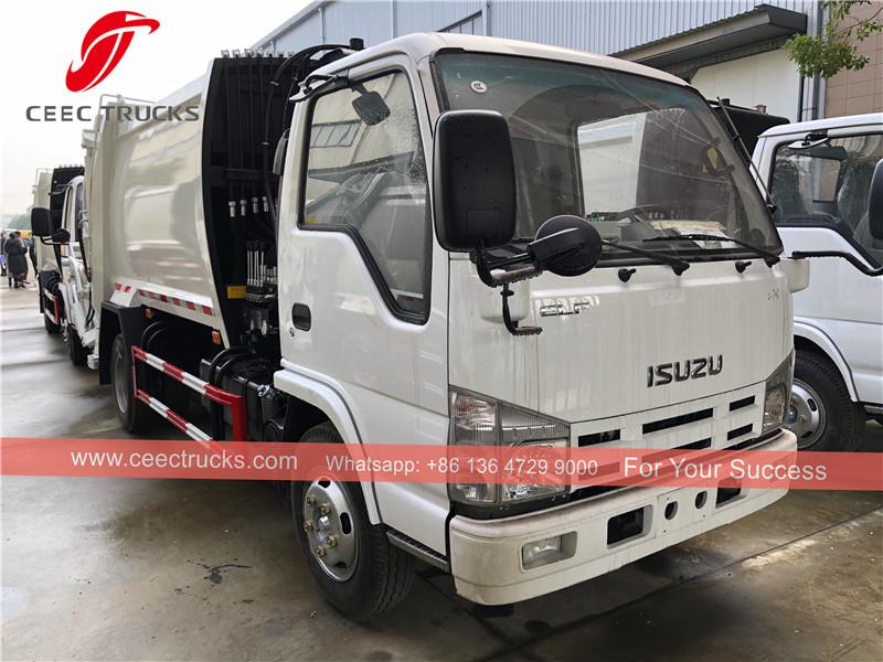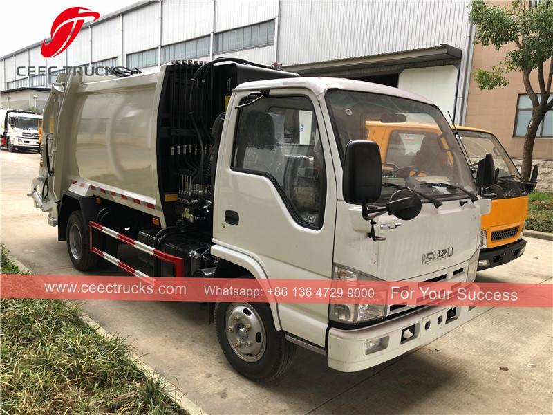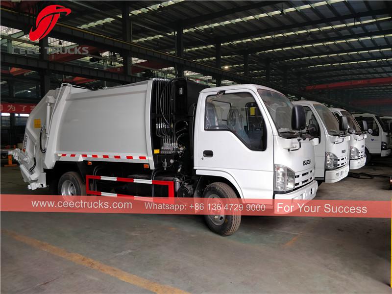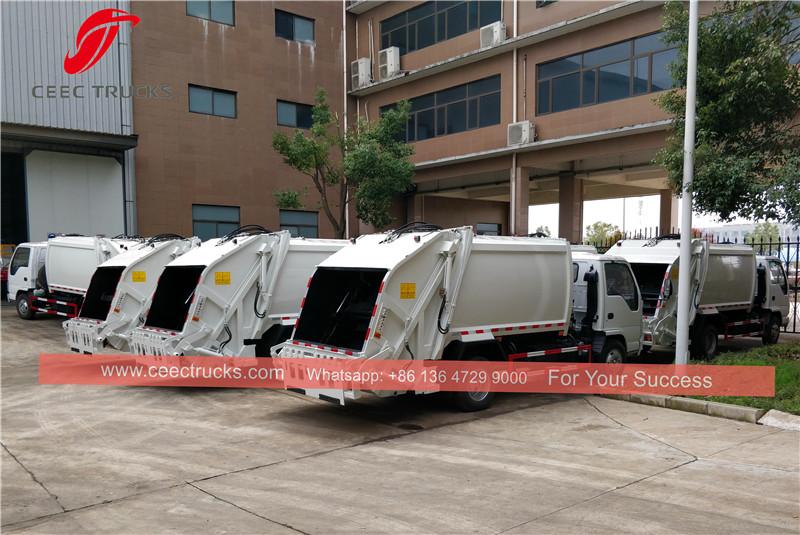 Trak pemadat sisa ISUZU 5 CBM di loji, bersiap sedia untuk dihantar.