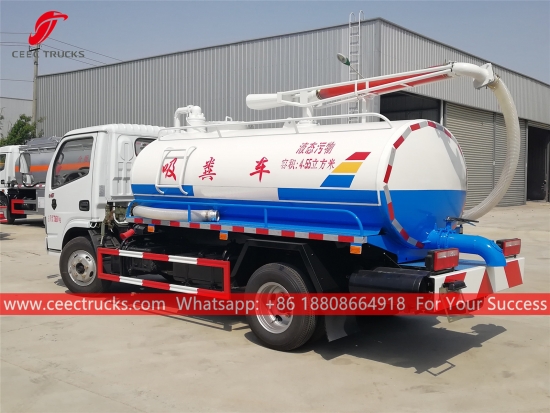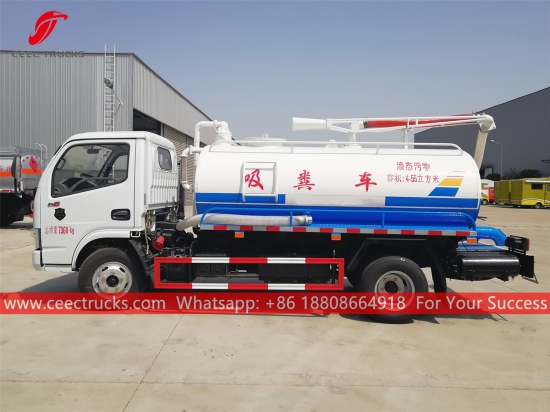 Trak tangki vakum Dongfeng 4.5cbm, model Pacuan Tangan Kiri 4x2 casis, kotak gear manual 5-anjakan, enjin diesel CHAOCHAI 102HP, mengecat dan logo bergantung pada keperluan.