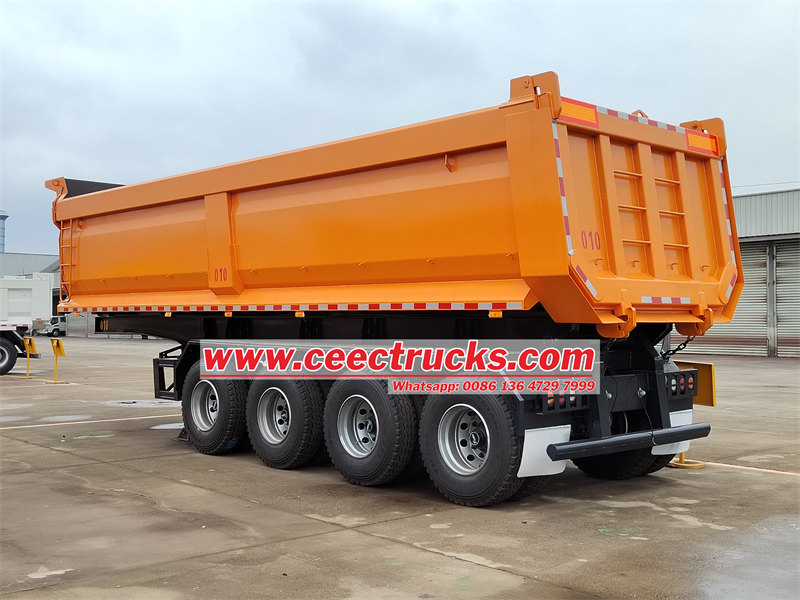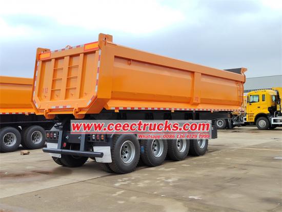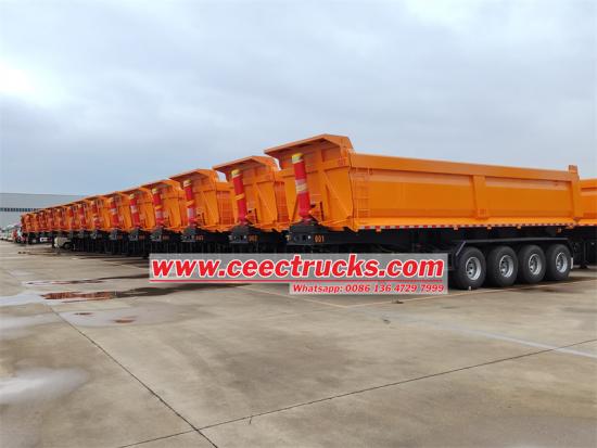 Separa treler pembuangan 4 gandar direka khas untuk pengangkutan yang cekap, dilengkapi dengan gandar FUWA 13 tan dan silinder hidraulik HYVA, yang mempunyai kapasiti pemuatan 50 tan. Dengan dimensi 12000mm x 2500mm x 3200mm dan berat sendiri 12 tan, ia menampilkan sistem brek pneumatik dwi litar dan suspensi spring plat keluli untuk memastikan pemanduan yang stabil. Sesuai untuk pelbagai senario termasuk perlombongan, pembinaan, pembinaan jalan raya dan pertanian, ia adalah pilihan yang ideal untuk meningkatkan kecekapan pengangkutan dan mengurangkan kos.