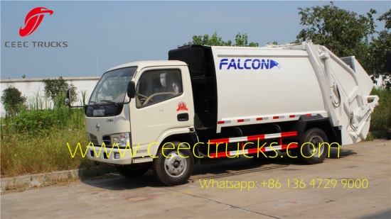 Trak pemadat sampah Dongfeng, casis Dongfeng 4*2 LHD / RHD, jarak roda 3300mm, kotak gear manual 5-anjakan untuk pemanduan mudah, injap kawalan hidraulik pelbagai fungsi Itali. badan tangki bahan keluli karbon dengan kapasiti 4 CBM