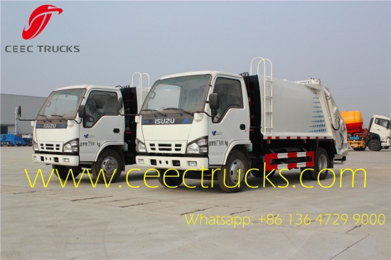 Trak sampah termampat ISUZU 4 CBM mengeksport Myanmar Yangon, casis ISUZU 4*2, enjin 4KH1-TCG40 dengan 120HP, kotak gear manual MSB 5-anjakan, badan tangki bahan keluli karbon, dengan ketebalan untuk sisi dan lantai 4mm. pemampat sampah LHD ISUZU 4000 liter kami mengeksport negara Afrika secara meluas