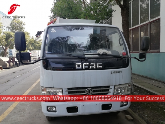 Trak pengumpul sisa dapur DONGFENG 5cbm, casis DONGFENG 4x2, kotak gear manual 5-anjakan manual, enjin diesel QUANCHAI 115HP, peranti angkat sisi automatik, dilengkapi dengan pintu belakang hidraulik, pengecatan dan logo bergantung pada keperluan.