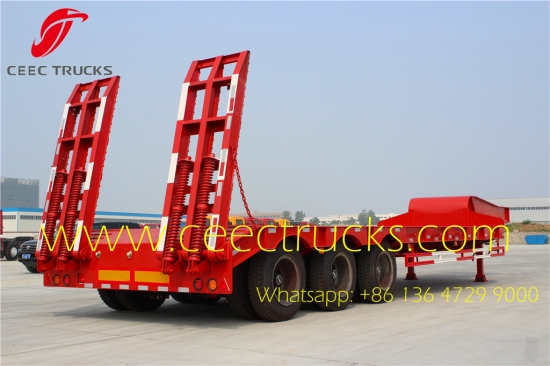 Semitrailer katil rendah 3 gandar reka bentuk TOP, rasuk-I Q345, gandar BPW dengan pilihan 12-20T, kaki pendaratan JOST dan pin raja untuk prestasi terbaik. semitrailer katil rata rendah kapasiti 50T kami mengeksport negara Afrika secara meluas.