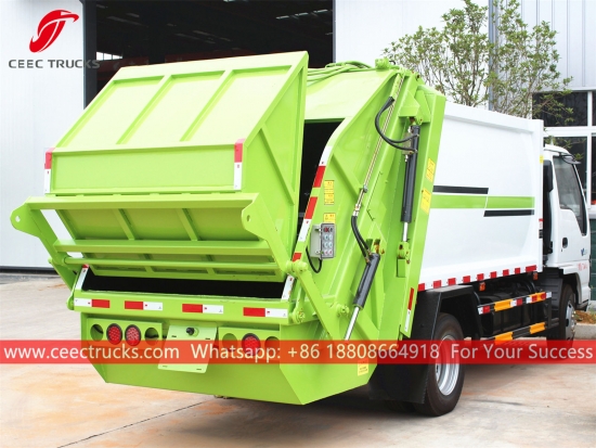 Bahagian atas lori pemampatan 5,000Liter standard Eropah, yang menggunakan badan pemadat bahan keluli kekuatan tinggi, model PLC kawalan import, peranti kawalan silinder hidraulik, kotak kawalan versi Bahasa Inggeris untuk operasi yang mudah.