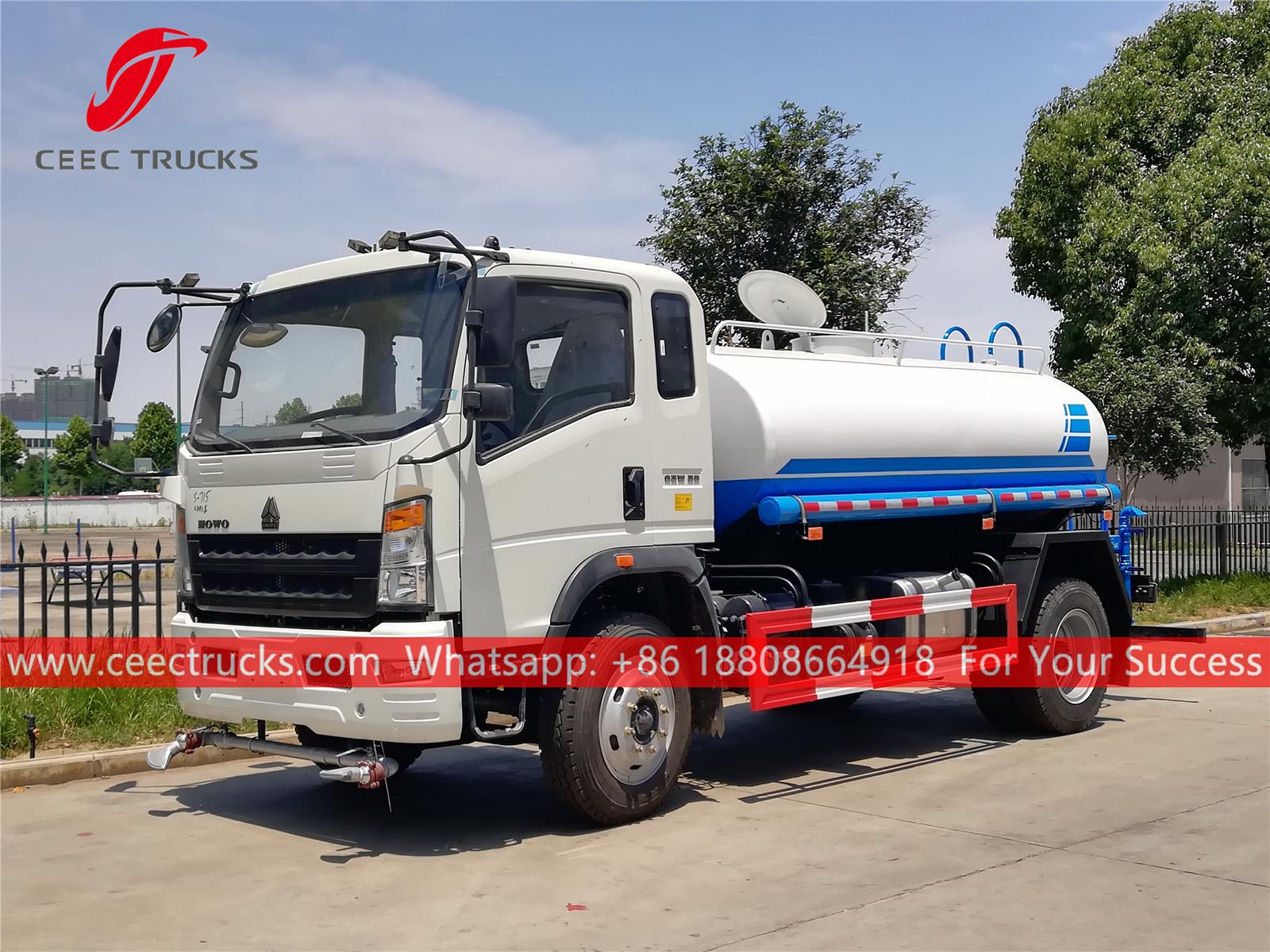 Trak semburan air HOWO 8,000L, casis pemacu tangan kiri HOWO 4x2, kotak gear manual 6 anjakan, enjin diesel SINOTRUK 160HP, pam air jenama terkenal, dengan muncung penyembur depan, tengah dan belakang pilihan. Semua lukisan dan logo bergantung pada keperluan.
