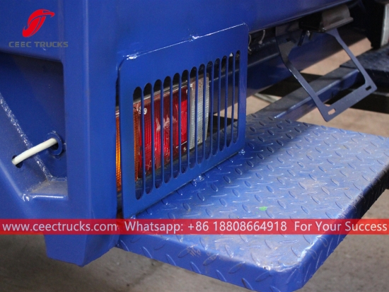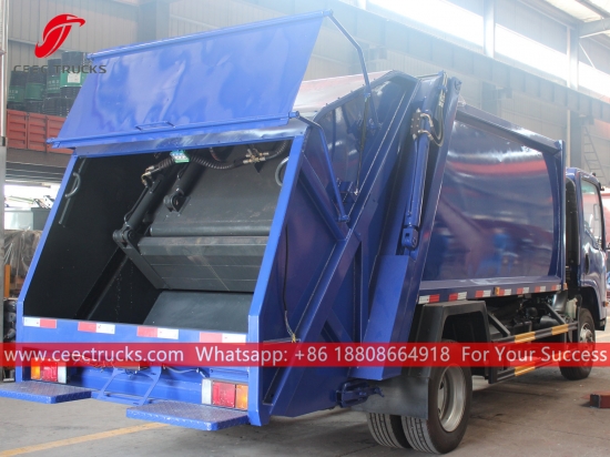 Struktur badan lori sampah 8,000Liter standard Eropah, yang menggunakan badan pemadat bahan keluli berkekuatan tinggi, model PLC kawalan import, peranti kawalan silinder hidraulik, kotak kawalan versi Inggeris untuk operasi yang mudah.