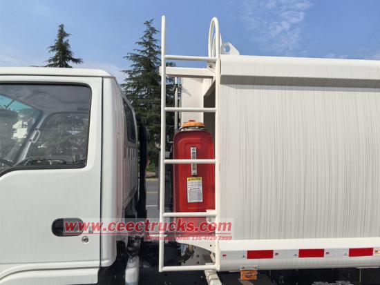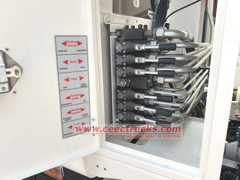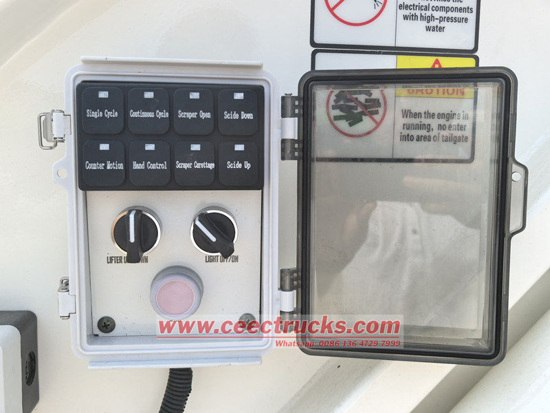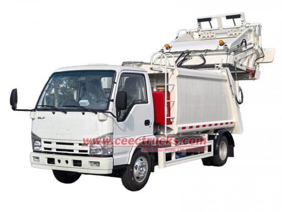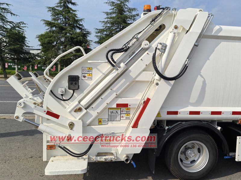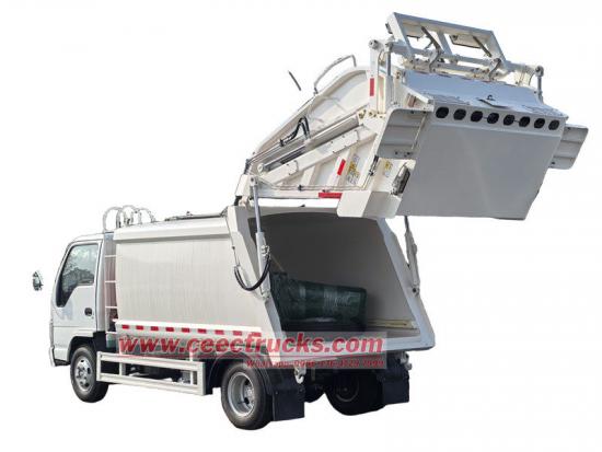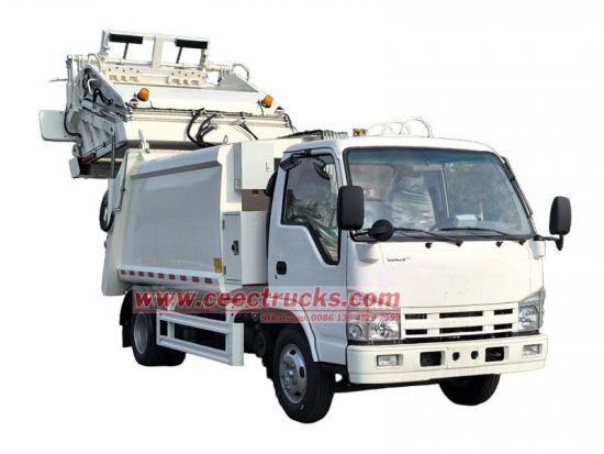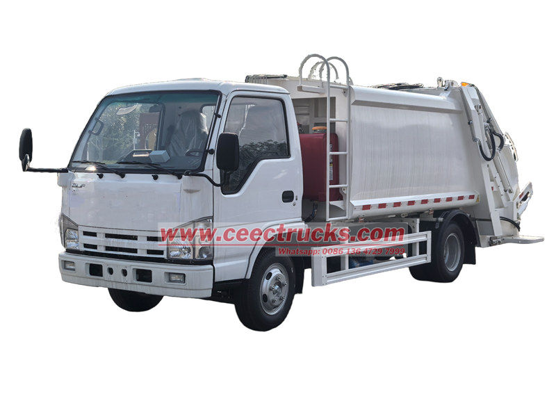 Trak pemuat pemadatan hidraulik Isuzu mempunyai fungsi mampatan berkuasa yang boleh memampatkan sampah longgar dengan cekap, meningkatkan kapasiti pemuatan dan mengurangkan kekerapan pengangkutan. Dengan jarak roda 3360mm dengan enjin 4JB1CN 98hp, pelepasan Euro 4 diesel 2.771L, Isuzu MSB 5-shiftgearbox, 700R16 pcs dengan totally 16 pcs Penyaman udara, USB, bantuan arah, 3 tempat duduk. Bahagian atas badan adalah tong sampah 6cbm, belakang adalah mekanisme flip baldi, terdapat 3 kaedah untuk mengendalikan trak memuat dan memunggah.