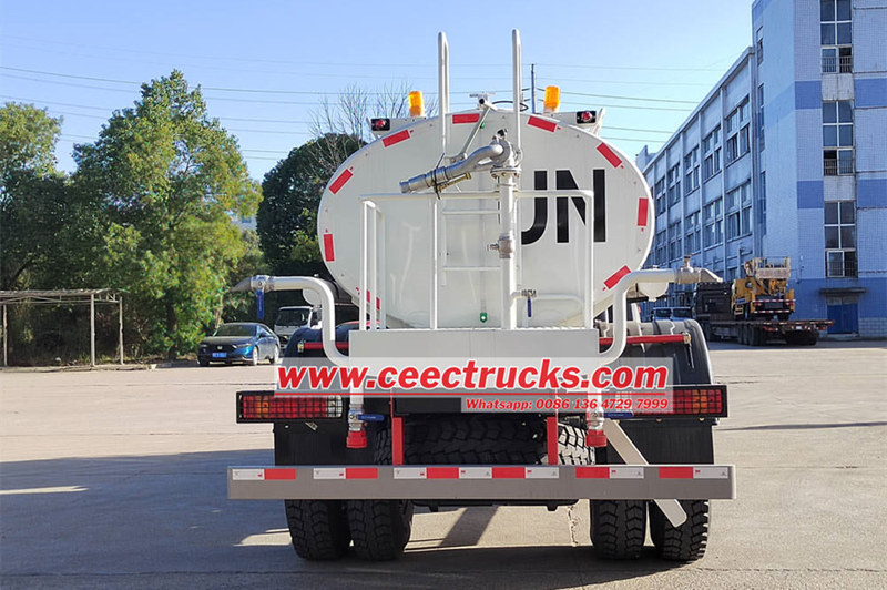 Trak bowser air pacuan 4 roda Beiben mempunyai fungsi pengangkutan air, saliran, memadam kebakaran kecemasan, dan lain-lain. Ia dikonfigurasikan dengan pembilasan depan, penyiraman belakang dan penyemburan sisi, pam air khas penyebuan sendiri, pam boleh mengepam air dan air longkang, dengan sambungan api, injap aliran sendiri, platform kerja di belakang tangki, dan meriam pemercik penghijauan yang dipasang. Meriam boleh berputar dan melaraskan isipadu air (semburan dalam lajur, kabus, gerimis).