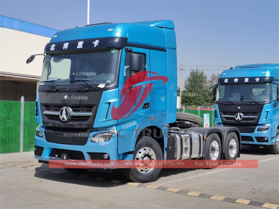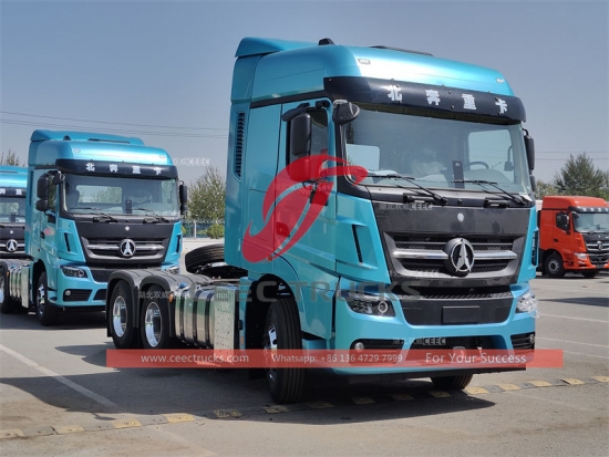 Trak traktor Beiben 6x4 V3, LHD atau RHD, enjin diesel WEICHAI 560HP, kotak gear manual 9-shift PANTAS, berat tunda maksimum boleh sehingga 40Ton, pengecatan dan logo bergantung pada keperluan.