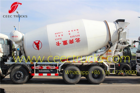 trak pembancuh konkrit beiben NG80B 3134, sistem penggerudian tangan kiri 8*4, dengan transmisi anjakan ZF 9, kabin Benz NG80B digunakan sepenuhnya dengan standard ECR29, gandar teknologi terkenal Benz, tayar 12.00R20. 14 trak pengadun beiben volum CBM mengeksport negara Afrika