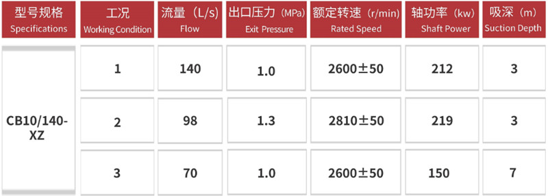 Pam ini mempunyai kadar aliran terkadar 70 hingga 140 L/s, tekanan terkadar kira-kira 1.0 MPa, dan kepala maksimum melebihi 100 meter. Ia menampilkan permulaan pantas, lif sedutan tinggi dan bekalan air yang stabil. Kapasiti sedutan yang kuat membolehkan penyebuan sendiri yang cepat (sehingga ketinggian kira-kira 7m apabila digunakan dengan peranti pengalihan air vakum).