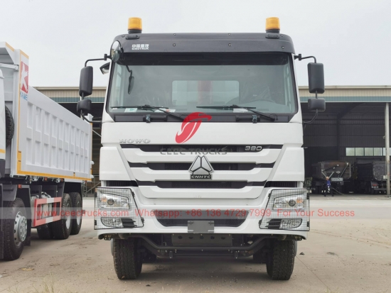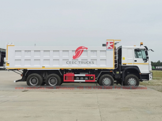 Trak tipper HOWO 8×4 China, casis HOWO 8x4 LHD, kotak gear manual 12 anjakan SINOTRUK, enjin diesel WEICHAI 380HP jenama terkenal China, badan tipper keluli kekuatan tinggi, dengan HYVA atau pengangkat hidraulik domestik pilihan. Semua lukisan dan logo bergantung pada keperluan.