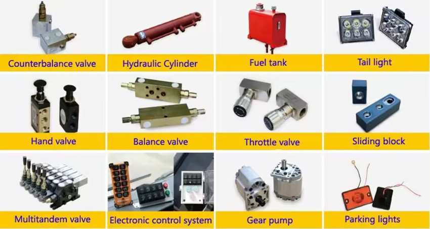♦ Komponen: Termasuk pam hidraulik, injap kawalan arah berbilang hala, silinder hidraulik, tangki minyak dan paip.