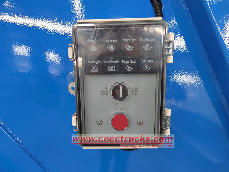 ♦ Struktur: Terletak di hujung belakang bekas, ia terdiri daripada pengikis, plat slaid, panel sisi dan silinder hidraulik, menyerupai corong.