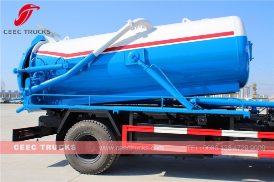 Pengosong cesspit Dongfeng 10000L, enjin diesel CUMMINS 170HP, kotak gear manual 6 anjakan, tangki bahan keluli berkekuatan tinggi boleh sehingga 10 cbm, pam vakum WEILONG, alat angkat hidraulik untuk pelepasan sisa, mengecat dan logo bergantung pada permintaan.