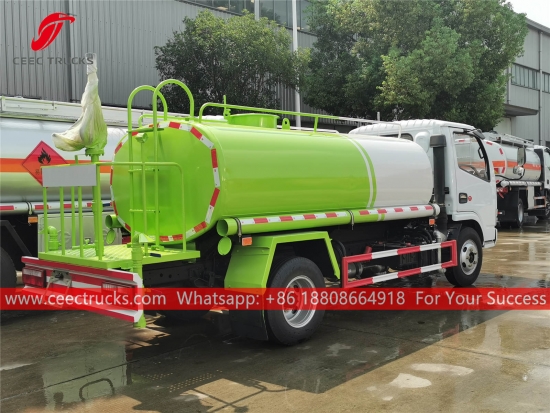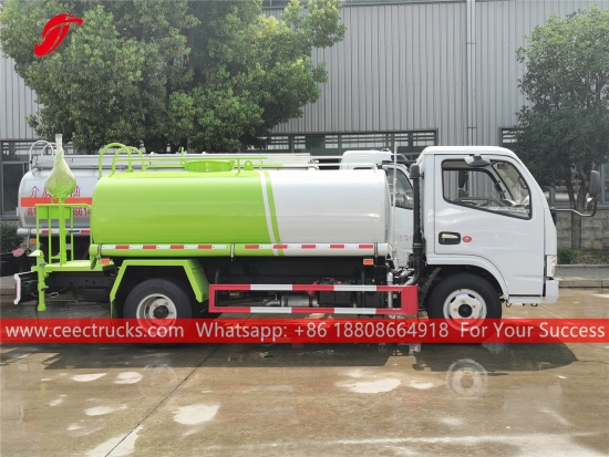 Trak tangki air DONGFENG 5,000L, casis pemacu tangan kiri DONGFENG 4x2, kotak gear manual 5 anjakan, enjin diesel YUCHAI 115HP, pam air jenama terkenal, dengan muncung penyembur depan, tengah dan belakang pilihan. Semua lukisan dan logo bergantung pada keperluan.