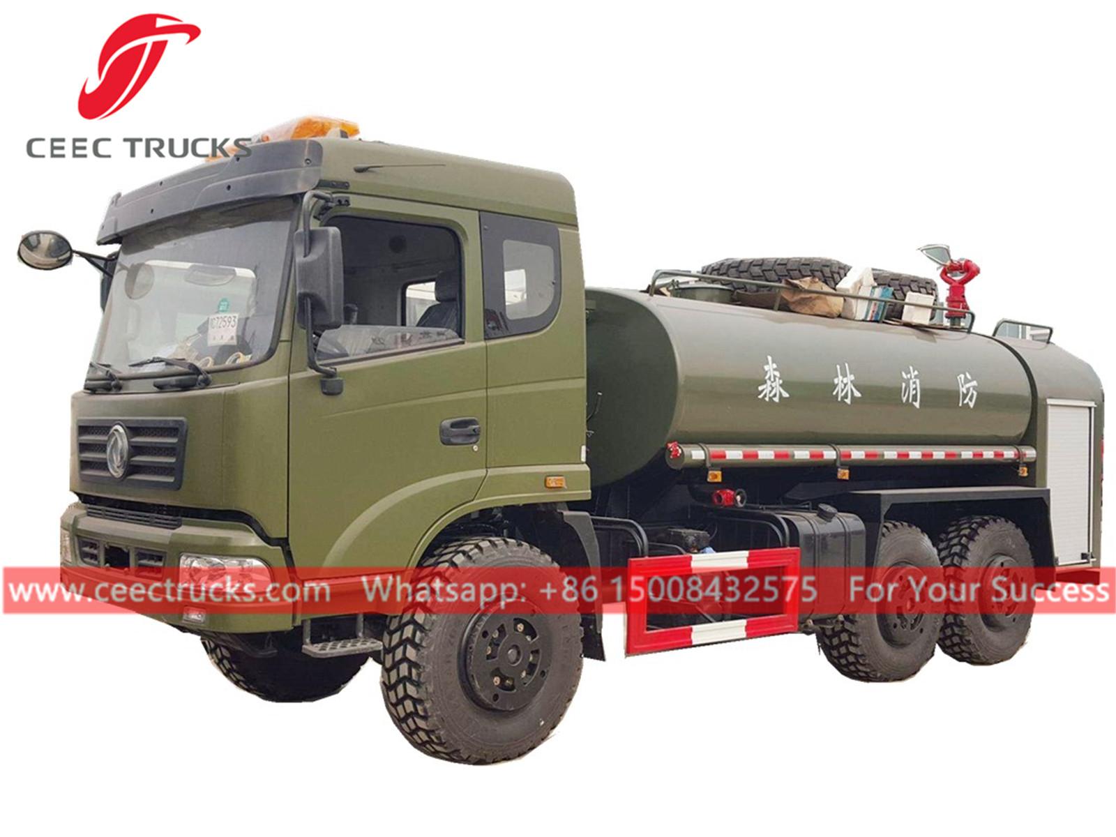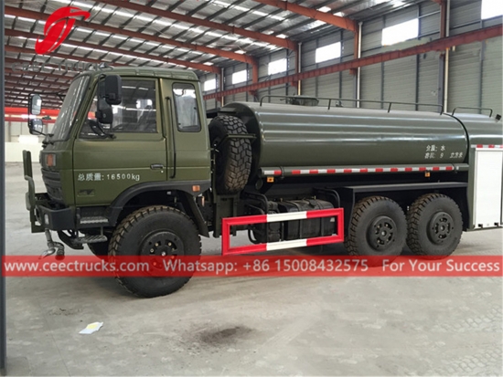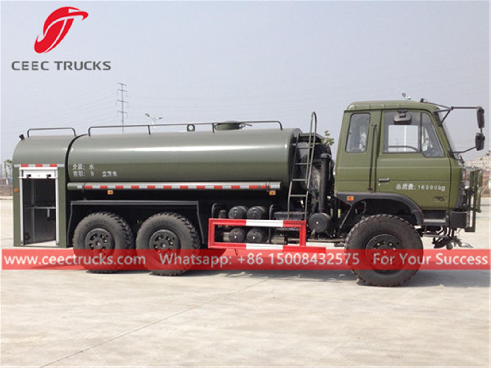 Trak pemercik air 9,000L ketenteraan, casis pacuan semua roda 6x6 klasik DONGFENG, dilengkapi kotak gear manual 6-anjakan, enjin diesel CUMMINS 210HP, pam air jenama terkenal, dengan muncung penyembur depan, tengah dan belakang pilihan, Semua lukisan dan logo bergantung pada keperluan.