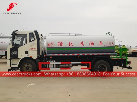 Trak tunduk air FAW 11,000L, casis pemacu tangan kiri FAW 4x2, kotak gear manual 6 anjakan, enjin diesel FAW 224HP, pam air jenama terkenal, dengan muncung penyembur depan, tengah dan belakang pilihan. Semua lukisan dan logo bergantung pada keperluan.