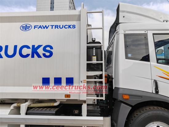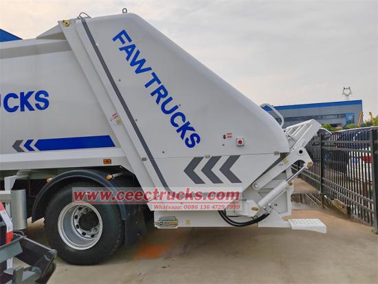 Pemacu kanan FAW 10 padu trak pemadat sampah, ia diubah suai berdasarkan casis pemacu kanan FAW J5K, jarak roda 4770mm, dilengkapi dengan enjin XICHAI CA6DF2D-18 180hp Euro 2, FAW CA6TBX051M 6-kelajuan kotak gear, kotak gear karbon padu tahan karat 10 bahagian atas. mekanisme flip baldi gantung ekor, kenderaan dilengkapi dengan kotak kawalan elektronik teksi, tuil operasi hidraulik manual sebelah pemandu, kotak kawalan elektronik pintu belakang dengan jumlah 3 kedudukan operasi