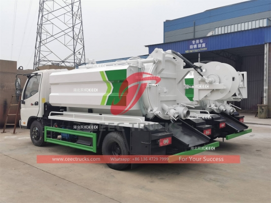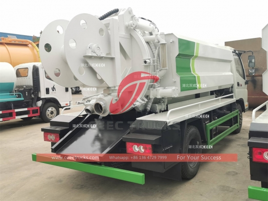 eksport trak pancutan pembetung mini gabungan FOTON ke Tanzania, casis FOTON 4x2 RHD, kotak gear manual 6-anjakan, enjin diesel CUMMINS 141HP, tayar 7.00R16 dengan satu tayar ganti, pam jet tekanan tinggi jenama terkenal dan pam vakum. Semua lukisan dan logo bergantung pada keperluan.