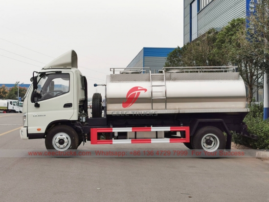 Lori Tangki Susu 4000L FOTON (juga dipanggil trak tangki air keluli tahan karat FOTON, tangki susu boleh diminum FOTON 4×2, pengeluar tangki susu keluli tahan karat FOTON, trak tangki air boleh diminum FOTON, trak tangki susu FOTON SS 304) ialahdigunakan untuk pembersihan jalan, penghijauan pokok dan rumput, pembersihan bangunan tinggi, pembinaan jalan dan kilang. Ia mempunyai fungsi membilas, menyiram, mengangkut air dan memadam kebakaran.