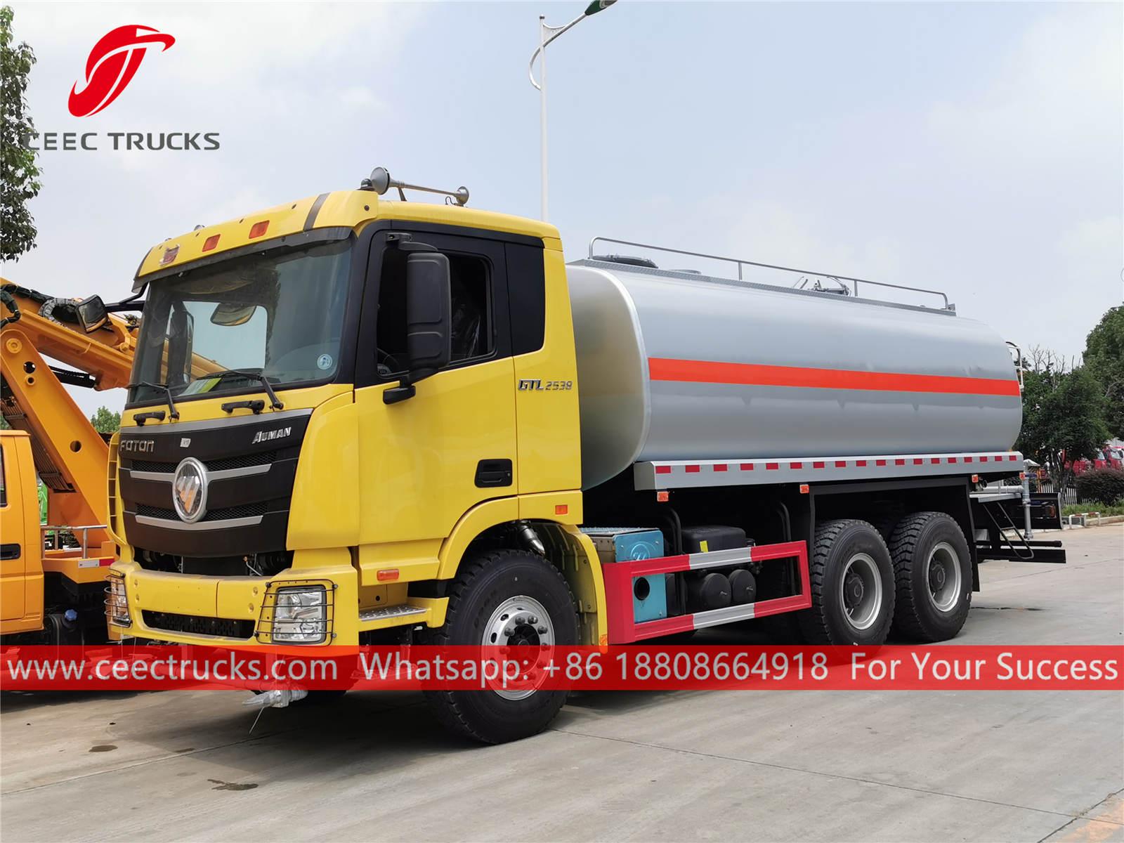 Trak penyembur air FOTON 20,000L, casis FOTON 6x4, kotak gear manual 8-anjakan CEPAT, enjin diesel CUMMINS 245HP, pam air jenama terkenal, dengan muncung penyembur depan, tengah dan belakang pilihan. Semua lukisan dan logo bergantung pada keperluan.