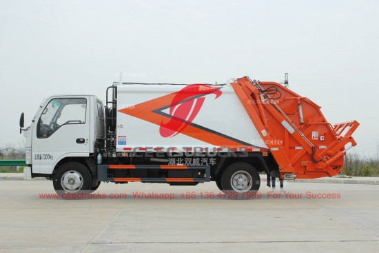 Trak pemadat sampah ISUZU 100P 4×2 6cbm, casis trak tugas ringan ISUZU ELF 100P, dilengkapi dengan enjin diesel ISUZU 98HP, gear transmisi 5-anjakan MSB. Sistem kawalan CAN-bas untuk operasi yang mudah. Semua lukisan dan logo berdasarkan keperluan pelanggan.