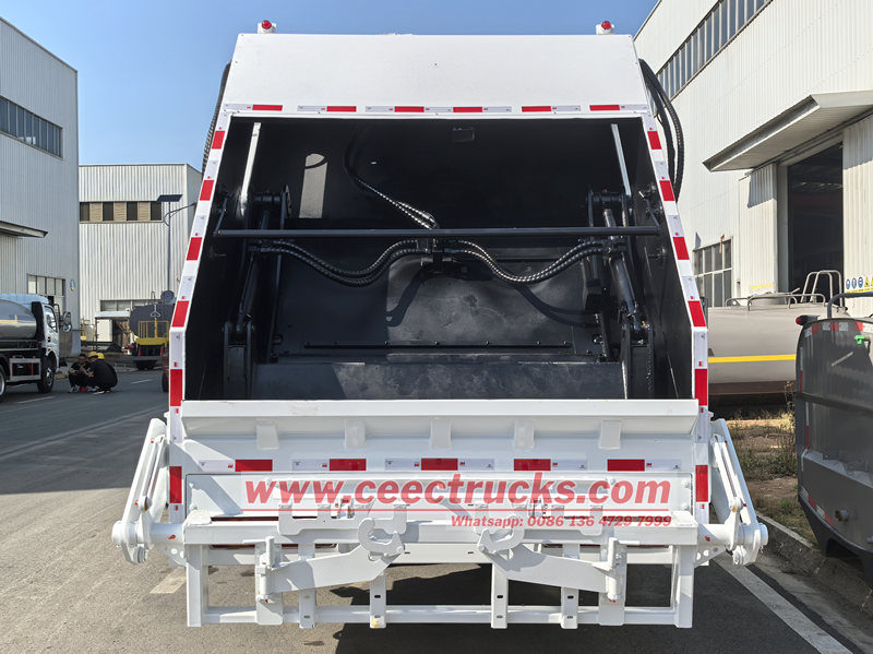 Rear tilting device for 770L and 1100L binsTrak pemadat pemuat belakang HOWO 14cbm ialah peralatan utama untuk sanitasi bandar, yang menyepadukan teknologi elektromekanikal dan hidraulik. Semasa operasi, sistem hidraulik memacu penyodok tolak untuk memampatkan sampah dengan kuat, mengurangkan jumlah sampah dan meningkatkan jumlah pengangkutan tunggal. Petak tertutup sepenuhnya dan peranti pengumpulan kumbahan berkesan menghalang kebocoran kumbahan dan taburan sampah semasa pengangkutan, mengelakkan pencemaran sekunder. Pada masa yang sama, trak kompaktor pemuat belakang HOWO dilengkapi dengan sistem pengendalian pintar, menyokong pelbagai kaedah pengumpulan sampah, dan mudah dan cekap untuk dikendalikan.