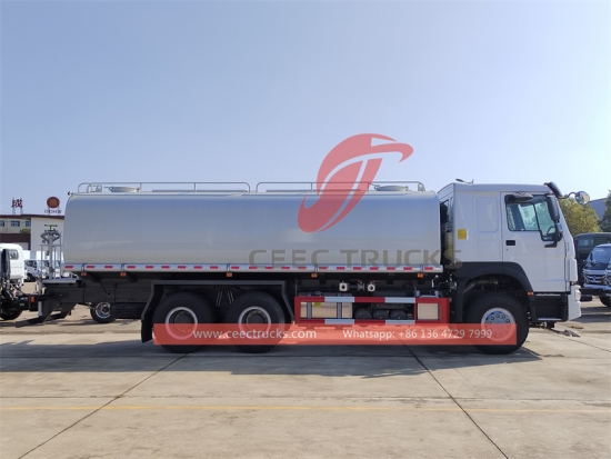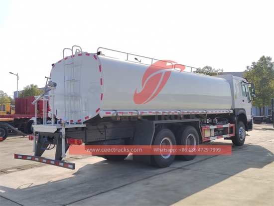 Trak penanduk air Howo 20,000L, casis pemacu tangan kiri Howo 6x4, kotak gear manual 8 anjakan, enjin diesel WD615.47 371HP, pam air jenama terkenal, dengan muncung penyembur depan, tengah dan belakang pilihan. Semua lukisan dan logo bergantung pada keperluan.