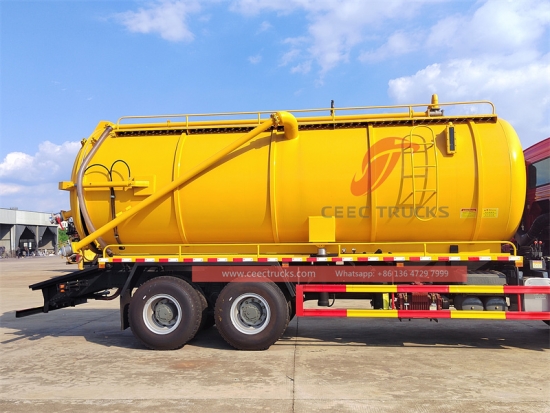 HOWO 400hp Trak Tangki Vakum (juga dipanggil trak kumbahan vakum, penyedut pembetung, trak kumbahan HOWO, pengosong parit, trak tangki septik, pengosong septik) ialah kenderaan tugas berat yang direka khusus untuk pengumpulan dan pengangkutan kumbahan dan air sisa.Tri tangki HOWO dilengkapi dengan sistem vakum berkuasa yang membolehkannya mengeluarkan kumbahan dengan berkesan daripada pelbagai sumber, termasuk saluran paip pembetung, lubang lurang dan tandas. Sistem ini berfungsi dengan mencipta daya sedutan yang kuat, yang dihasilkan oleh pam vakum, yang menarik kumbahan ke dalam tangki. Proses ini dipermudahkan oleh hos dan kelengkapan khusus yang bersambung ke trak dan sumber kumbahan.