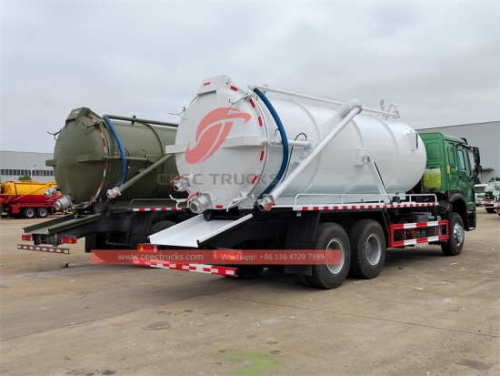 HOWO 400hp Trak Tangki Vakum (juga dipanggil trak kumbahan vakum, penyedut pembetung, trak kumbahan HOWO, pengosong parit, trak tangki septik, pengosong septik) digunakan untuk mengumpul, mengangkut dan mengeluarkan cecair seperti air kotor, enap cemar, septik, minyak mentah, dan bahan pepejal seperti batu kecil, batu bata juga. Ia sesuai untuk membersihkan pembetung, cesspit, cesspool, gully, dll. Ia digunakan secara meluas dalam persekitaran dan bidang sanitasi.