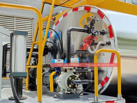 Teknologi tangki penebat dua lapisan:Tangki asfalt 3000L menggunakan lapisan penebat asbestos setebal 80mm + plat luar beku keluli tahan karat, dan penurunan suhu dalam masa 8 jam ialah ≤12 ℃, yang sangat mengurangkan bilangan pemanasan berulang asfalt dan mengurangkan penggunaan bahan api. Reka bentuk plat pemecah gelombang terbina dalam menghalang asfalt daripada bergegar dan percikan semasa pengangkutan, meningkatkan keselamatan.