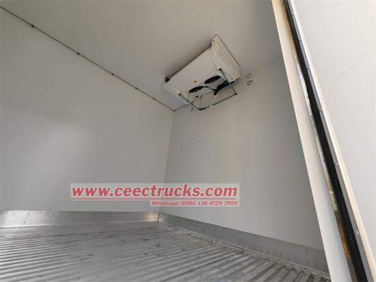 Trak peti sejuk HOWO 4x2, ia diubah suai pada casis trak ringan siri HOWO Leader, jarak roda 3360mm, dilengkapi dengan enjin Weichai WP3NQ160E61 160 kuasa kuda, kotak gear 6-kelajuan Xingrui ML650A, badan peti sejuk atas 4100×2300×Saiz 2050mm, bahan gentian kaca, FRP + busa PU + bahan panel FRP 105 mm, panel sandwic tertutup sepenuhnya, pintu sebelah kanan, pintu belakang berkembar bersaiz penuh, lantai tidak licin dan tahan haus, unit penyejukan bukan bebas pembawa CITIMAX D6.