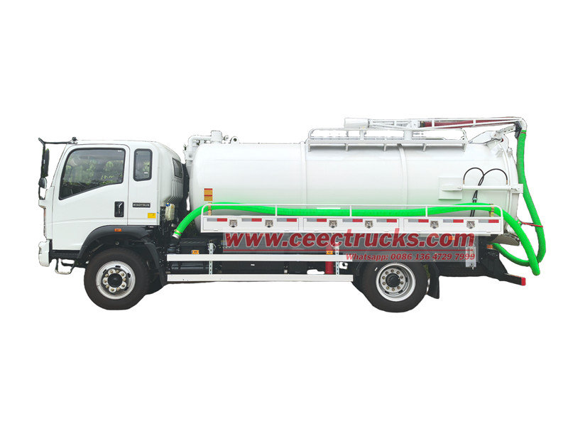 Howo 5,000 liter trak septik gandar tunggal (juga dipanggil Howo 5cbm trak pam sedutan vakum, trak tangki vakum Howo 5,000 liter, trak pam tangki septik Howo 4x2, Howo 6 roda lori pam septik, trak sedutan kumbahan vakum Howo.) digunakan untuk mengumpul, mengangkut dan mengeluarkan cecair seperti air kotor, enap cemar, septik. Badan tangki telah dirawat dengan rawatan anti-karat dan anti-karat dan sangat tahan lama. Digabungkan dengan pam vakum berkuasa tinggi, ia mempunyai sedutan yang kuat dan merupakan peralatan profesional yang sangat diperlukan dalam tadbir urus alam sekitar bandar dan luar bandar.