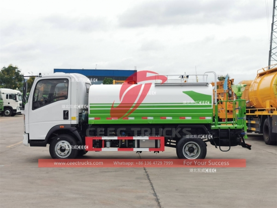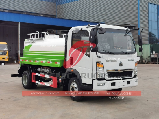 Trak air HOWO 5,000L, casis tugas ringan sinotruk howo 4x2, kotak gear manual 5 anjakan, enjin diesel 116Hp terkenal, pam air jenama terkenal China, dengan muncung penyembur depan, tengah dan belakang.
