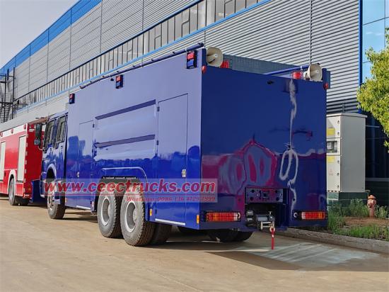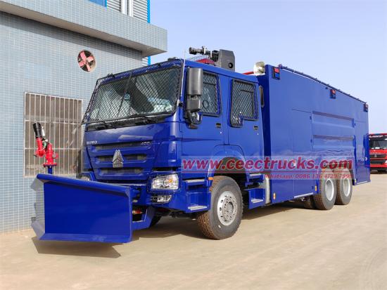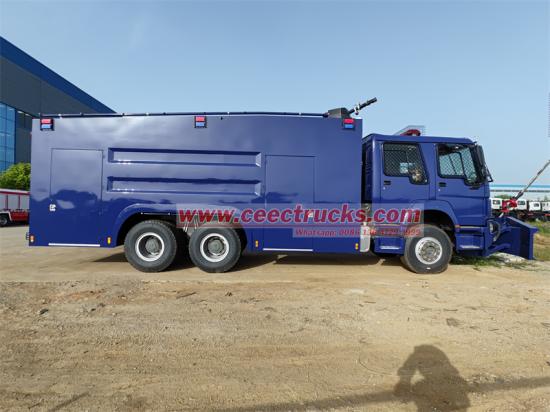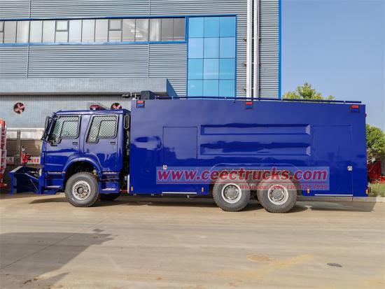 Trak meriam air kalis letupan HOWO 6x4 diubah suai berdasarkan casis teksi dua baris HOWO HW76, dengan jarak roda 4600+1350mm, dilengkapi enjin WP10H400E60 dan kotak gear HW15710. Kenderaan itu dilengkapi dengan kotak kalis letupan, senapang utama di bahagian atas dan senapang tambahan air hadapan di kepala, yang boleh mencapai kawalan rusuhan sepanjang, aliran besar dan jarak jauh; teksi dua baris, 6 penumpang; termasuk Kapal tangki Air: 12000L, Kapal tangki buih: 100L, Kapal tangki pewarna: 100L, Tangki air lada: 100L, dilengkapi dengan pam bomba CB10/60, bahagian hadapan kenderaan dilengkapi dengan plat keluli kalis rusuhan dan penyodok keluli penghalang hidraulik yang kuat; lampu dan kaca tingkap dilindungi oleh mesh keluli tahan karat.