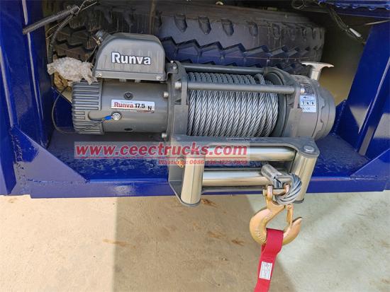 ● Sistem penyingkiran halangan hidraulik: Penyodok berbentuk V teleskopik dipasang pada bahagian hadapan kenderaan, dengan lejang silinder hidraulik 1.2m dan tujahan 15 tan, yang boleh menanggalkan penghalang jalan atau menolak kenderaan yang menghalang; permukaan penyodok ditutup dengan corak anti-gelincir, menyokong 180°lateral flipping untuk membantu dalam menangkap.