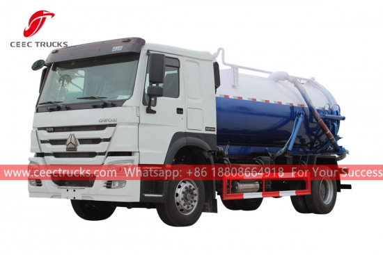 Trak sedutan kumbahan vakum HOWO 10cbm, model Pemacu Tangan Kanan HOWO 4x2 casis, kotak gear manual 9-anjakan, enjin diesel WEICHAI 266HP, pam vakum jenama terkenal China, mengecat dan logo bergantung pada keperluan.
