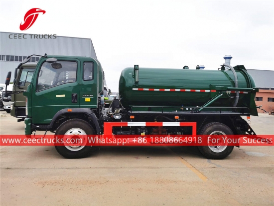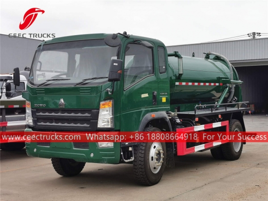 Trak penyedut pembetung HOWO 6cbm, casis HOWO Pemacu Tangan Kanan model 4x2, kotak gear manual 5-anjakan, enjin diesel CUMMINS 130HP, pam vakum jenama terkenal China, lukisan dan logo bergantung pada keperluan.