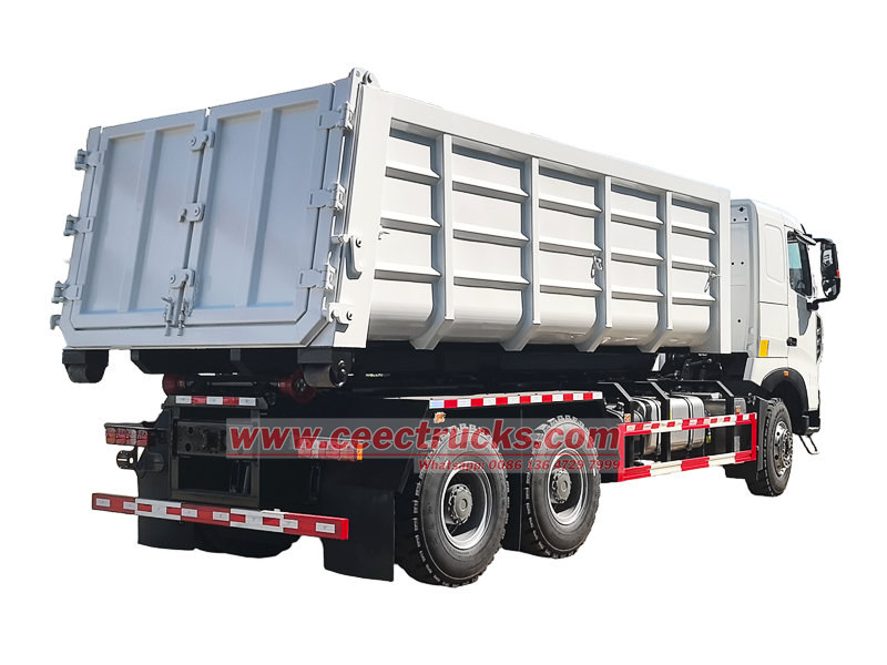 Trak roll on roll off kabin Howo T7H juga dipanggil trak kontena pemuat cangkuk Howo 6x4, trak sampah angkat cangkuk Howo, trak sampah cangkuk Howo 10 roda, trak sampah lengan Howo 440hp, dsb. Kenderaan itu diubah suai pada casis casis tugas berat HOWO 6x4, dilengkapi dengan enjin diesel MC11.44-50 berkuasa dan kotak gear HW19710, berkuasa, kapasiti bawaan besar, boleh disesuaikan dengan pelbagai keadaan jalan yang kompleks.